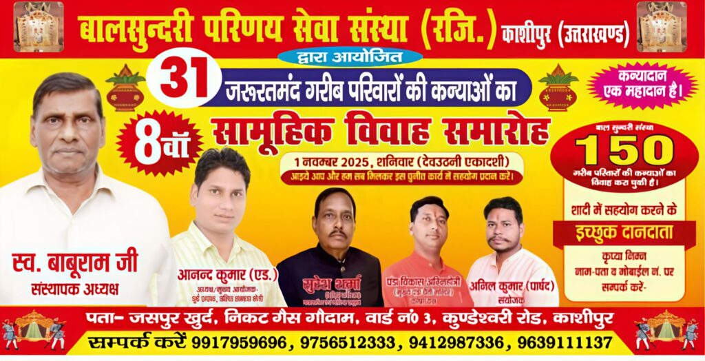 काशीपुर। 31 अक्टूबर2025 निर्धन परिवारों की कन्याओं के हाथ पीले करने का शुभ अवसर एक बार फिर आ गया है। बाल सुंदरी परिणय सेवा संस्था (रजि.) के तत्वावधान में आगामी शनिवार, 1 नवंबर (देव उठान एकादशी) को चैती मेला प्रांगण में 31 निर्धन कन्याओं का सामूहिक विवाह धूमधाम से सम्पन्न किया जाएगा।