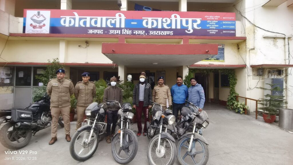 काशीपुर। 8 जनवरी 2026 कोतवाली काशीपुर पुलिस द्वारा अपराधियों के विरुद्ध चलाए जा रहे सघन अभियान के तहत वाहन चोरी की घटनाओं का सफल अनावरण करते हुए दो शातिर मोटरसाइकिल चोरों को गिरफ्तार किया गया है। पुलिस ने उनके कब्जे व निशानदेही पर कुल चार चोरी की मोटरसाइकिलें बरामद की हैं।